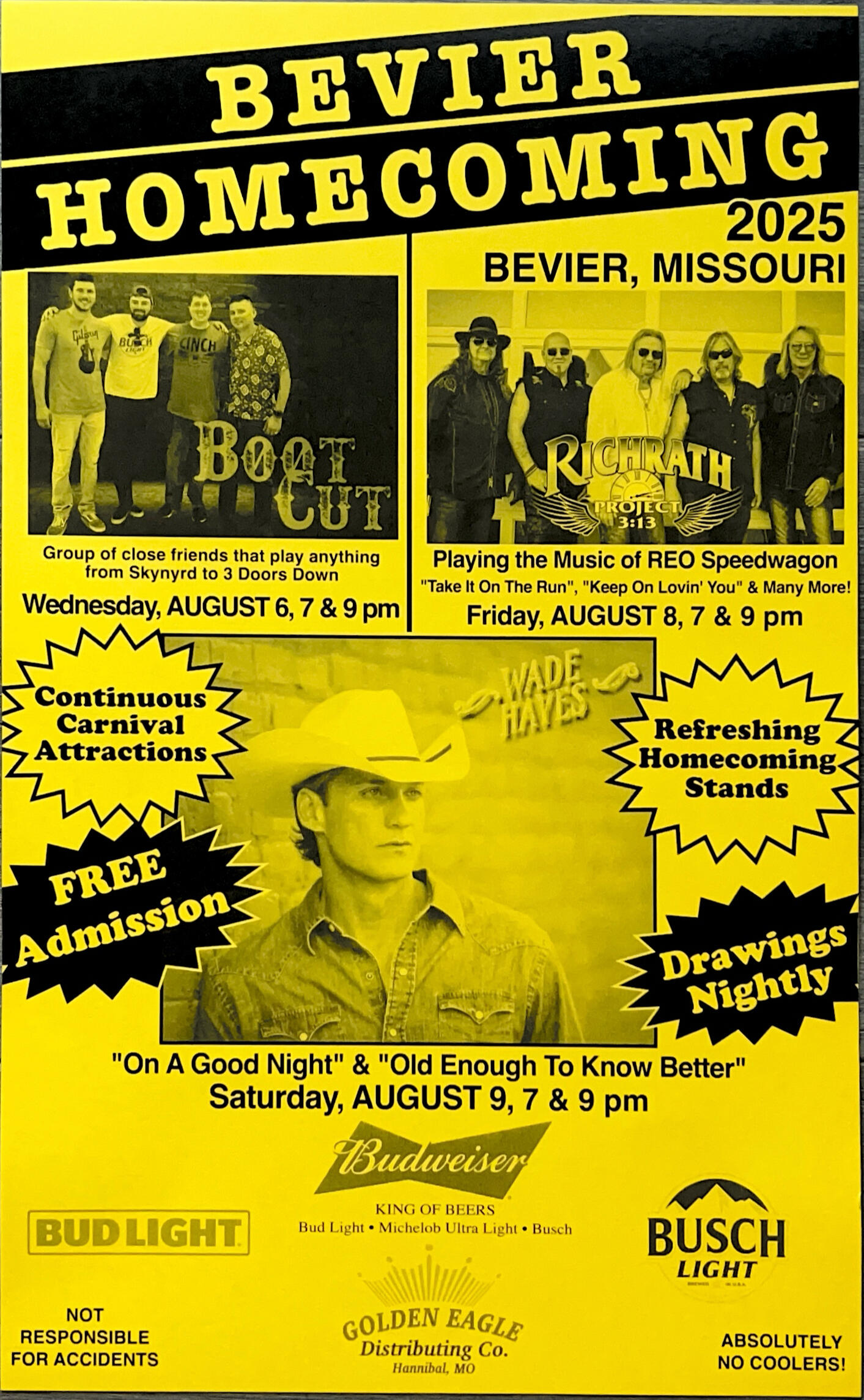 Celebrate the 92nd Annual Bevier Homecoming with thrilling carnival rides, food & beverages, and live music performances.
